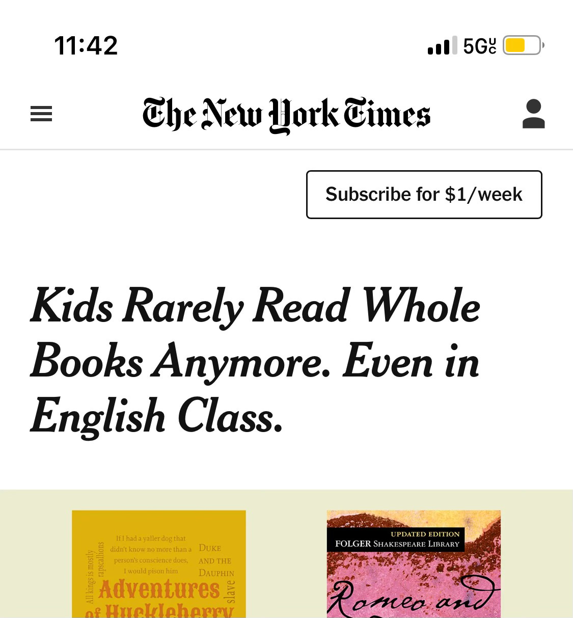 And so my answer to the problem: districts shouldn’t buy today’s textbooks. Teachers invited to committee meetings on textbook adoption should argue that they don’t want or need them. The tremendous amount of money that districts pay for these books should be redirected to purchasing actual novels and plays—cheap Dover editions have good footnotes and can last a long time. More expensive products from Norton and the like can have hard covers and include valuable supplementary material. In addition to novels and plays, there should be anthologies of short stories, poems, and essays. Better yet, teachers should find contemporary, free texts from valid sources online. Some of these are out of copyright, like Emerson’s “Self Reliance,” Thoreau’s “Walden,” The Declaration of Independence, and various essays by the likes of Payne, Virginia Woolf, Mary Wollstonecraft. Some contemporary essays are available free from publications such as The New Yorker, The Atlantic, Harpers, and even Substack! The Electric Typewriter is an outstanding clearinghouse of contemporary, much-discussed essays.